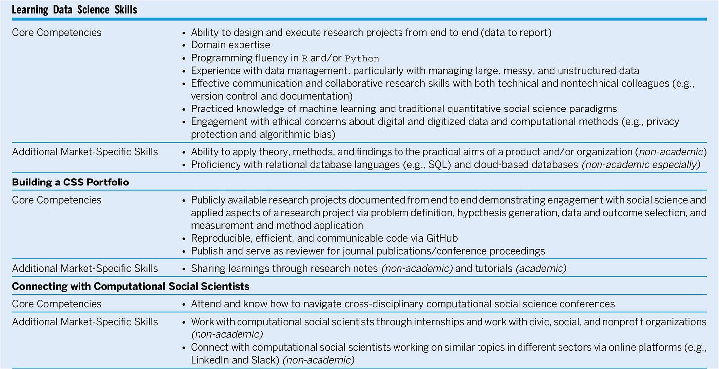 One more resource for computational social science PhD students, especially those from social science backgrounds with data science skills: I co-authored an article on how to prepare for both academic and nonacademic careers. It was written with researchers working in public and private universities, nonprofits, and for-profit firms. It can help you build a five-year plan for your PhD journey.